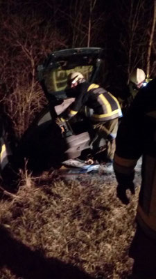 Sofort nach der Alarmierung rückten wir mit 2 Fahrzeugen aus. Nach der Erkundung durch den Einsatzleiter wurde die Beleuchtung aufgebaut, ein doppelter Brandschutz eingerichtet und das KFZ mit der Seilwinde des RLFs gesichert. Nach der Fahrzeugsicherung begab sich ein Kamerad in das Fahrzeug und begann mit der Versorgung des Verletzten. Ein weiterer Trupp bereitete währenddessen das Rettungstuch für die Menschenrettung vor. Die Menschenrettung wurde so schonend wie möglich durchgeführt.